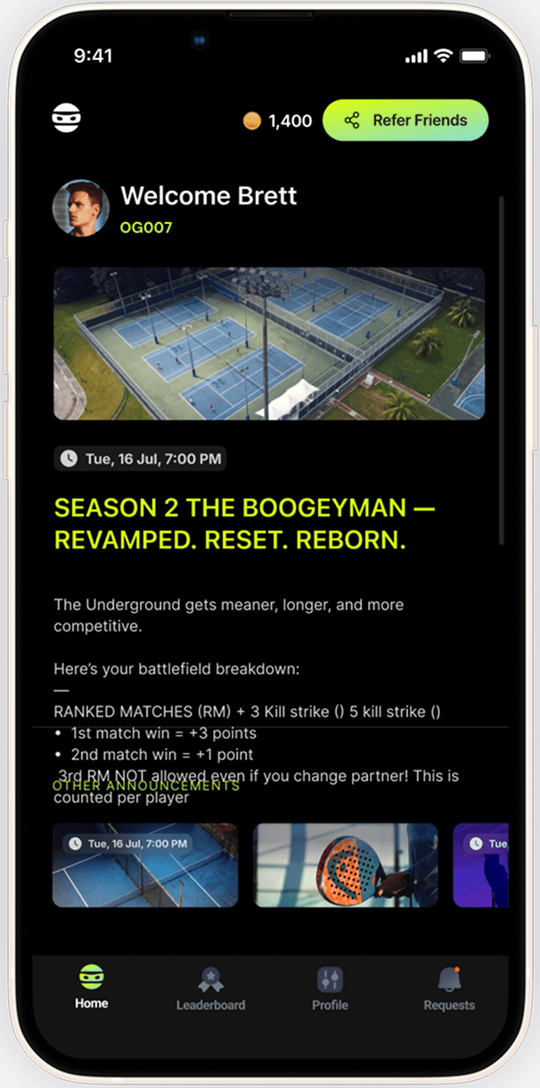 We built Underground Arena for the players who take the sport seriously — the ones who track every win, chase every rank, and push to be the best. Our platform turns casual padel into a competitive journey with live rankings, player profiles, achievement badges, and a progression system that rewards dedication.