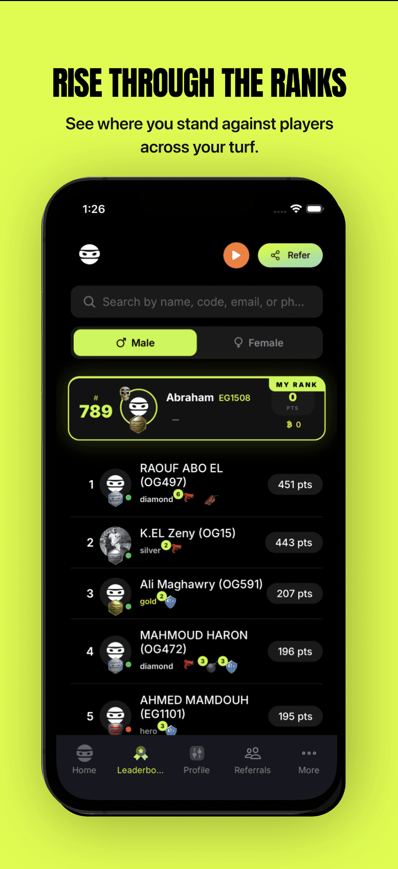 Underground Arena tracks your competitive journey in real time points, levels, and rankings all earned through real padel matches. Filter by gender, compare stats, and see exactly where you stand in your community.